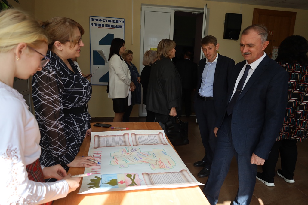 В фойе была проведена акция «Какой наш район». На плакате с картой района необходимо было написать ответы и пожелания в адрес станицы.