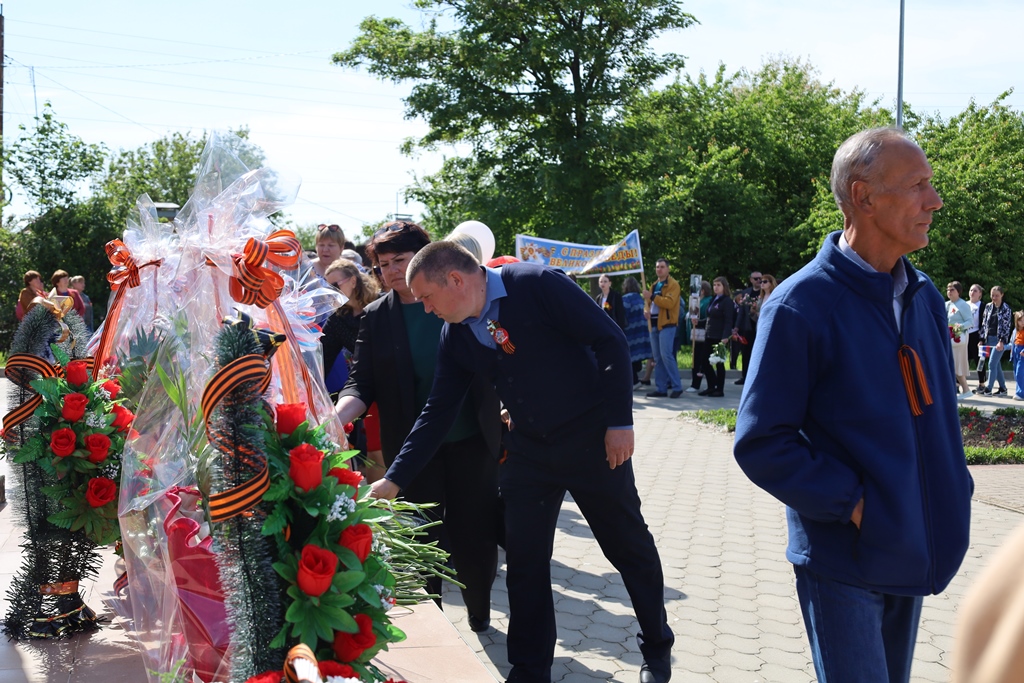 В День Победы на центральной аллее станицы прошли делегации от коллективов организаций, учреждений и предприятий. В ограниченном составе возложили цветы к Мемориалу защитникам Отечества и памятнику Героям специальной военной операции.